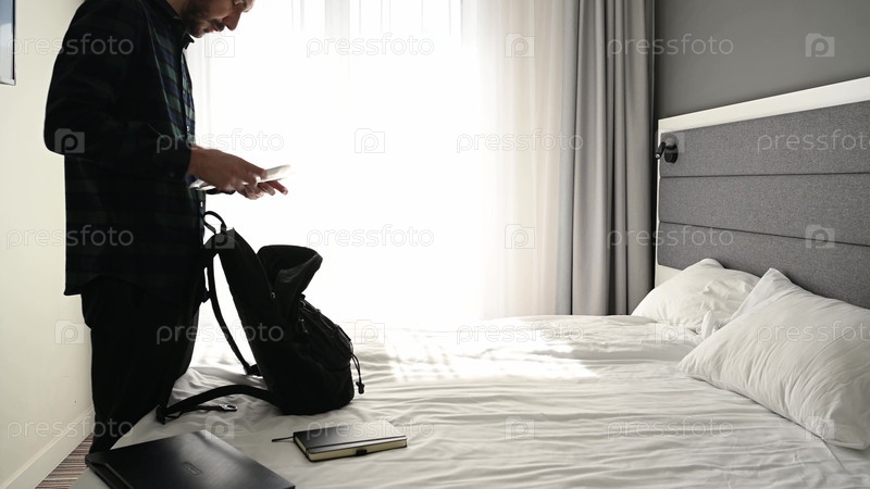 Мужчина собирается на работу, кладет документы, ноутбук, блокнот в портфель, застегивает его и уходит