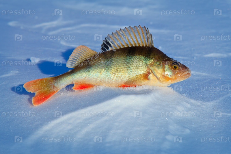 Крупная рыба окунь на синем льду