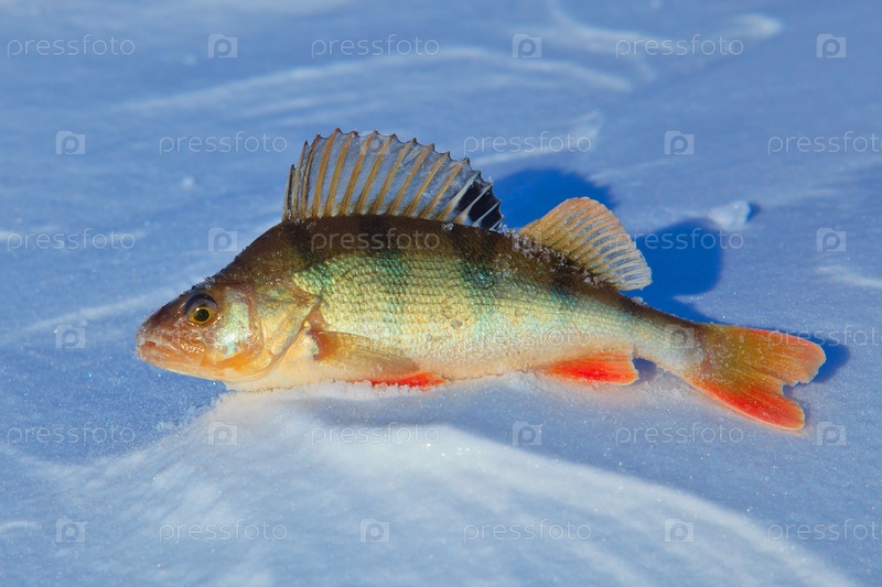 Крупная рыба окунь на синем льду