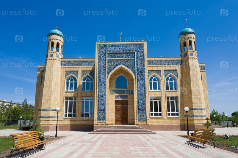 Красивая мусульманская мечеть в синем небе и траве. Высококачественное фото