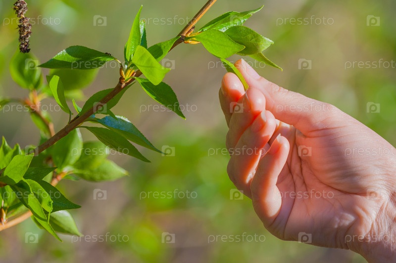 Рука касается листа на дереве на красивом размытом фоне