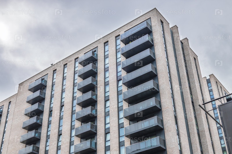 Современный жилой дом с балконами и стеклянными перилами под переменно-облачным небом