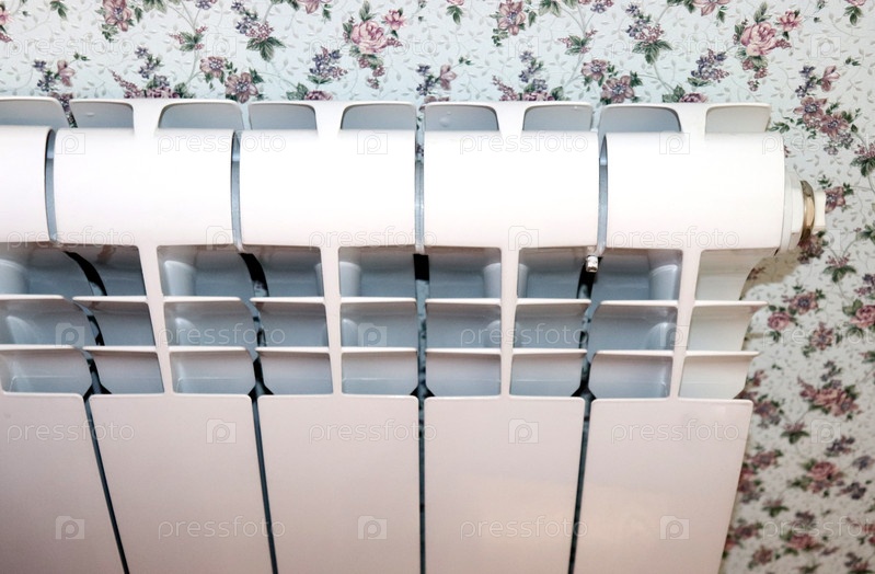 Металлический белый радиатор отопления в комнате, обои в стиле прованс