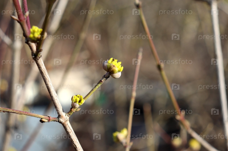 Ветка на цветущем кусте кизила с распускающейся почкой в солнечный весенний день