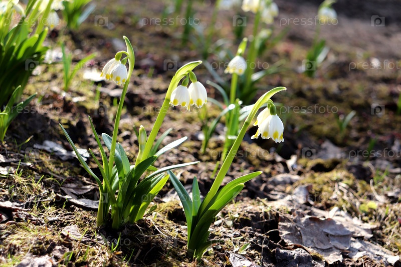 Цветы белоцветника в солнечный весенний день в земле среди сухих листьев