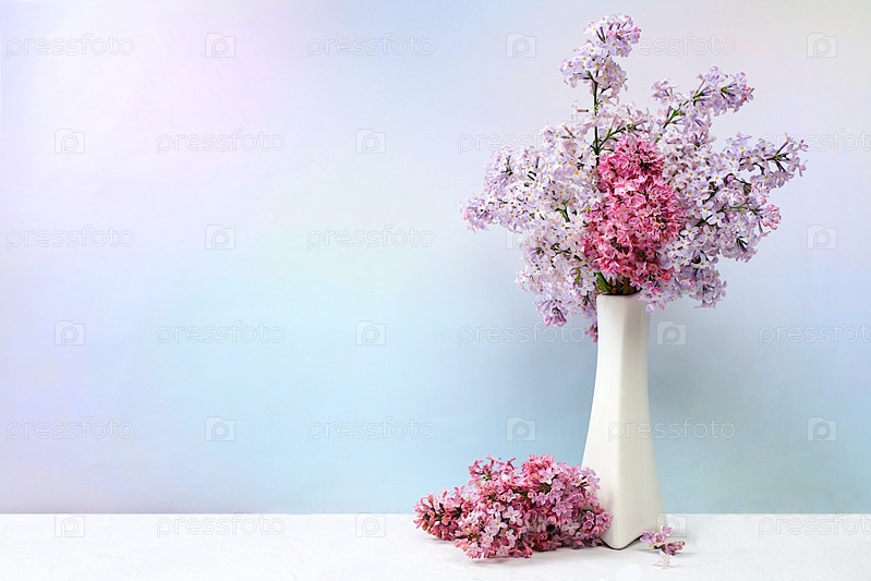 Красивый натюрморт с букетом фиолетовой сирени в вазе на элегантном современном фоне, шаблон для дизайна и флаер для экрана. Абстрактная цветочная композиция. Весенняя поздравительная открытка, подарок для любимых