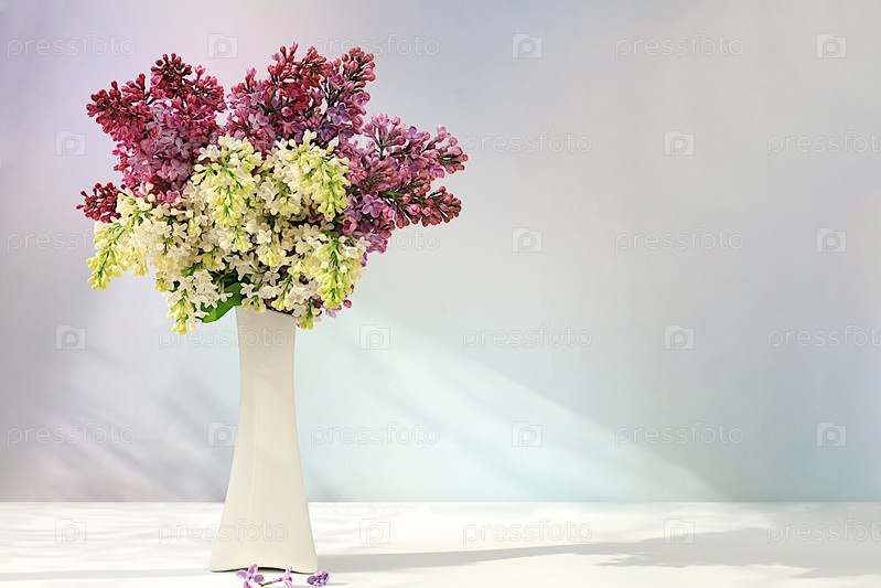 Красивый натюрморт с букетом белой и фиолетовой сирени в вазе на элегантном современном фоне, шаблон для дизайна и флаер для экрана. Абстрактная цветочная композиция. Весенняя поздравительная открытка,