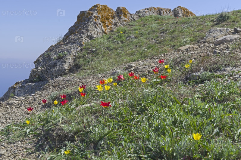 Тюльпан Шренка (лат. Tulipa suaveolens) на каменистом глинистом горном склоне на фоне скалы. В России этот вид тюльпанов занесен в Красную Книгу. Мыс Меганом, Крым, конец апреля