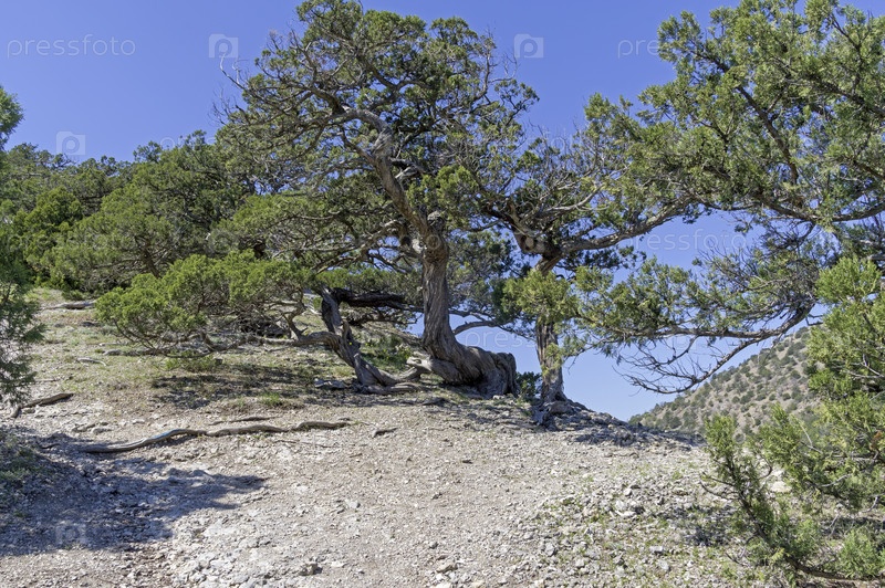 Реликтовые можжевельники, растущие вдоль тропы, идущей по берегу моря из Нового Света в Веселовскую бухту. Крым