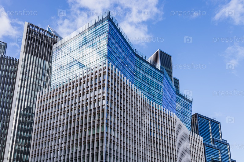 Современный небоскреб в Лондоне с фасадом из светоотражающего стекла и фоном из городского пейзажа