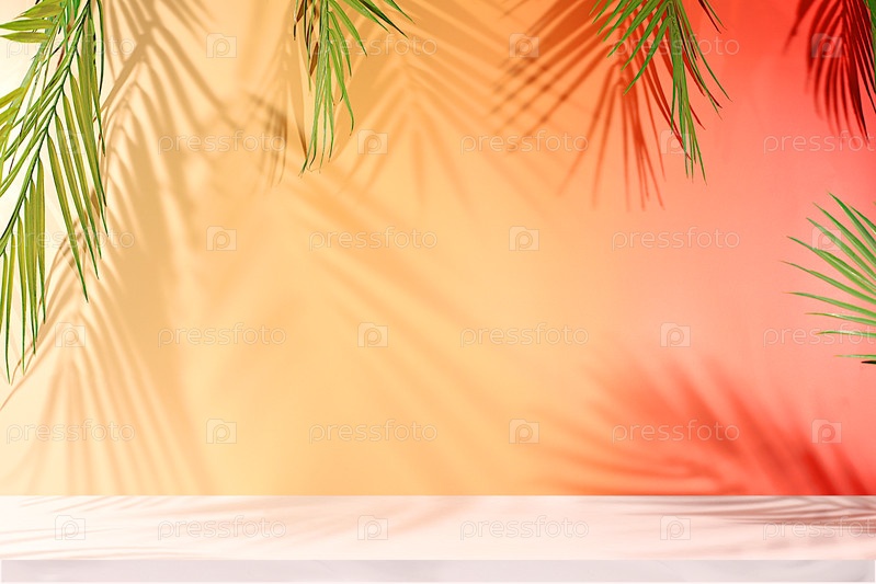 Пустой тропический солнечный красочный баннер, фон с длинными тенями от пальмовых листьев. Элегантный красивый подиум и шаблон для вашего творчества, концепция летней вечеринки и стенд для демонстрации продукции
