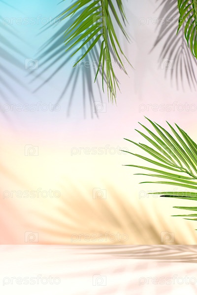 Элегантный солнечный красочный баннер, фон с длинными тенями от пальмовых листьев. Пустой красивый тропический подиум и шаблон для вашего творчества, концепция летней вечеринки и демонстрационный стенд для продукта