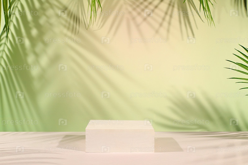 Пустой подиум на элегантном солнечно-зеленом фоне с длинными тенями от пальмовых листьев. Красивый шаблон и баннер для вашего творчества, концепция летней вечеринки и стенд для демонстрации продукции, флаер