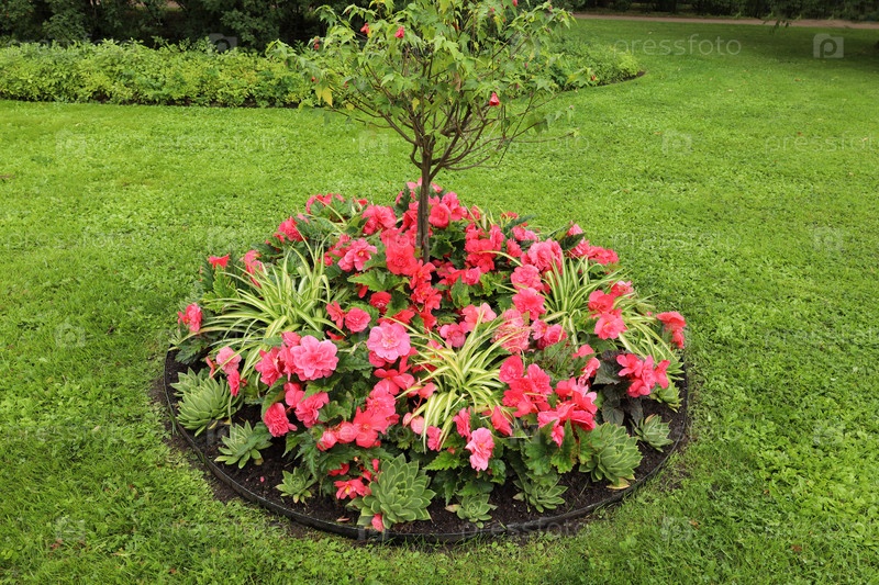 Яркая клумба в красных тонах из махровой бегонии, декоративных растений и суккулентов в летний день