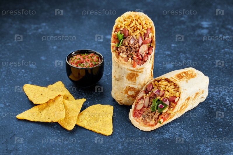 Традиционное мексиканское буррито с говядиной, чипсами начос и соусом сальса