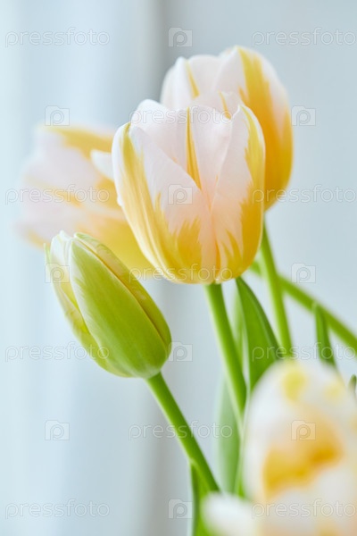 Букет белых и желтых тюльпанов в вазе на окне. Нежные цветы к празднику