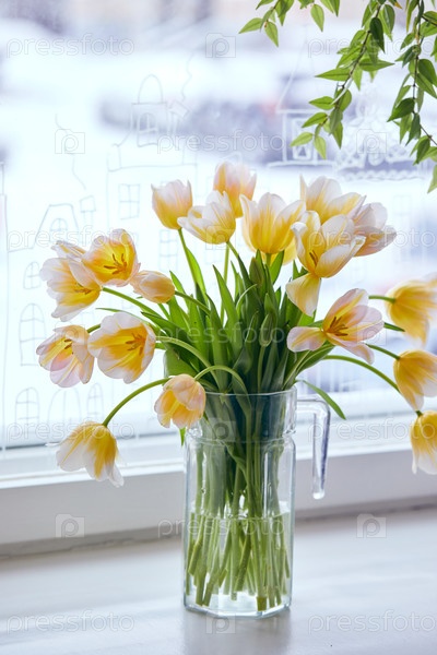 Букет белых и желтых тюльпанов в вазе на окне. Нежные цветы к празднику
