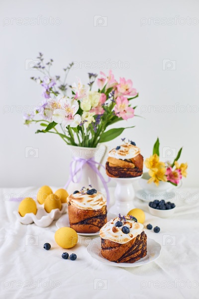 Традиционные пасхальные куличи на праздничном столе украшены живыми цветами и красочными расписными пасхальными яйцами