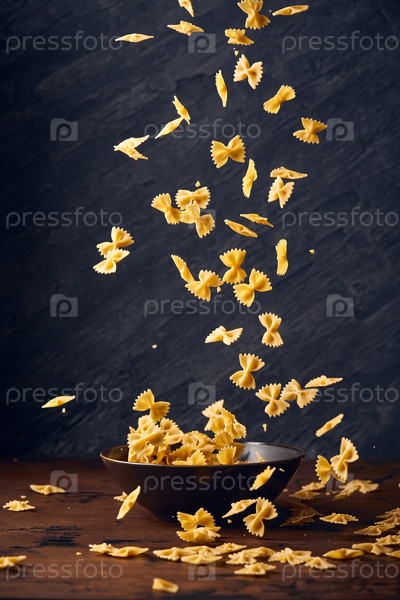 Паста-бабочка фарфалле парит над тарелкой на темном фоне