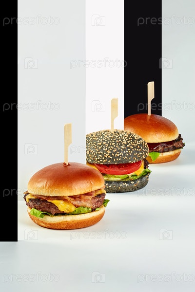 Три разных вида бургеров на черном и белом фоне. Фастфуд