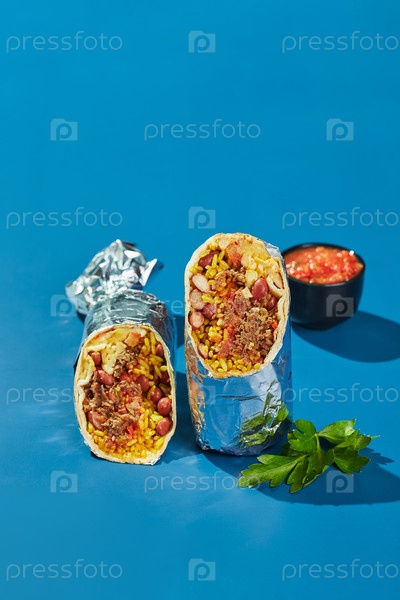Традиционное мексиканское буррито с говядиной, чипсами начос и соусом сальса
