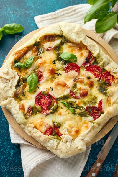 Пирог типа галет из слоеного теста с начинкой из помидоров, сыра моцарелла и соуса песто. Галет Капрезе. Вид сверху