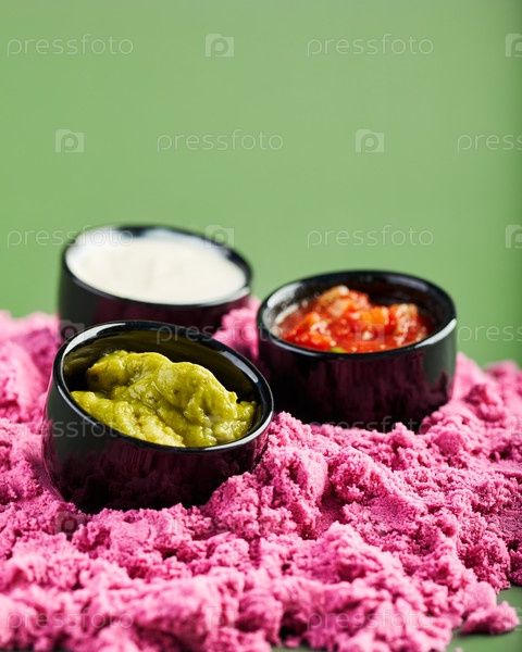 Набор различных соусов - сальса, гуакамоле и ранч в черных соусниках на зеленом фоне