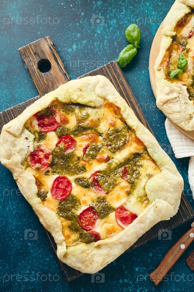 Пирог типа галет из слоеного теста с начинкой из помидоров, сыра моцарелла и соуса песто. Галет Капрезе. Вид сверху