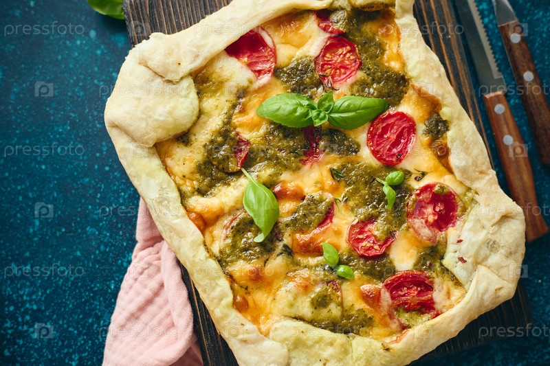 Пирог типа галет из слоеного теста с начинкой из помидоров, сыра моцарелла и соуса песто. Галет Капрезе. Вид сверху