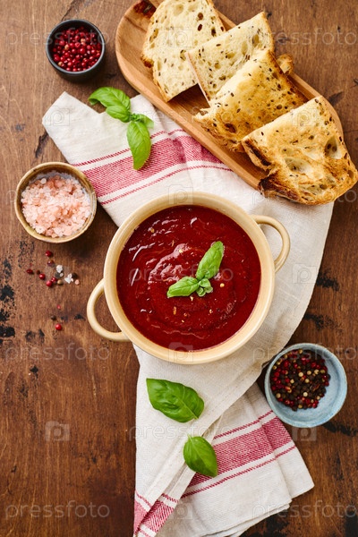 Томатный суп-пюре, украшенный листьями базилика и специями в керамической миске с поджаренными ломтиками хлеба на деревянном столе