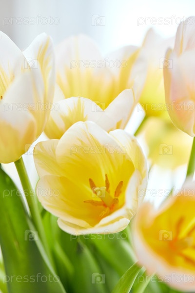 Букет белых и желтых тюльпанов в вазе на окне. Нежные цветы к празднику
