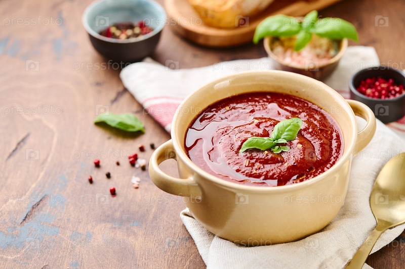 Томатный суп-пюре, украшенный листьями базилика и специями в керамической миске с поджаренными ломтиками хлеба на деревянном столе