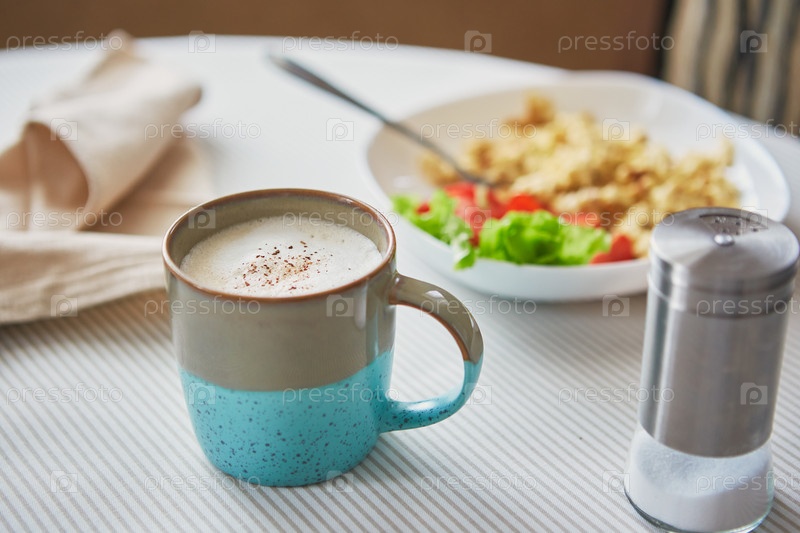 Завтрак на столе. Чашка кофе и тарелка с яичницей и овощами на столе