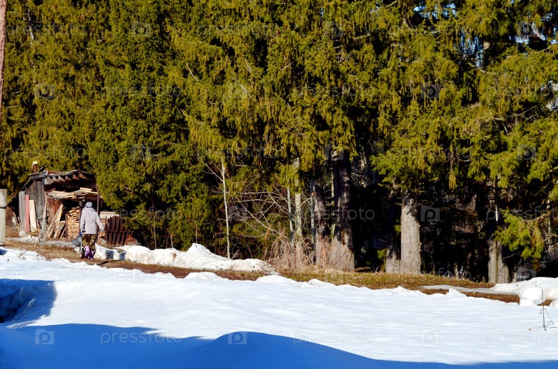 Сельская улица весной. женщина везет воду