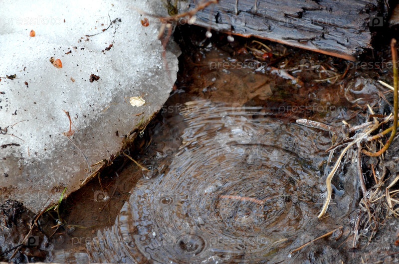 Весенняя капель. Падающие капли тающего снега с крыши в лужу