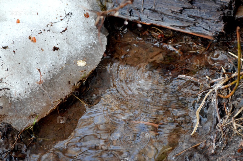 Весенняя капель. Падающие капли тающего снега с крыши в лужу