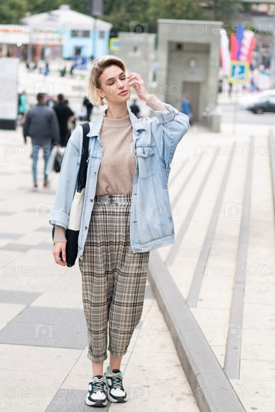 Молодая красивая женщина позирует в синей куртке на улице