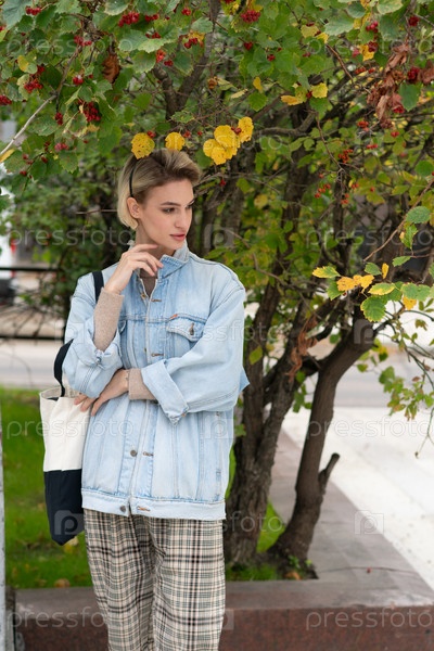 Молодая красивая женщина позирует в синей куртке на улице