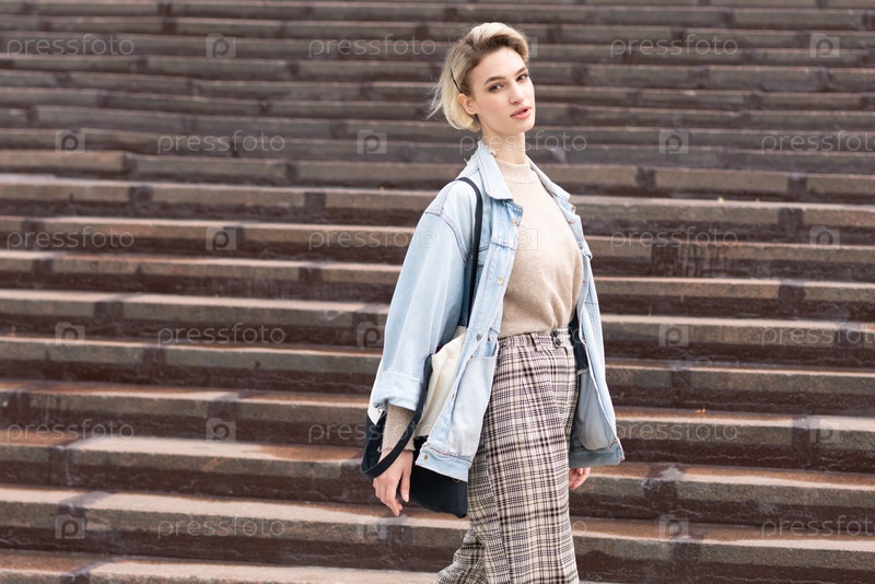 Молодая красивая женщина позирует в синей куртке на улице