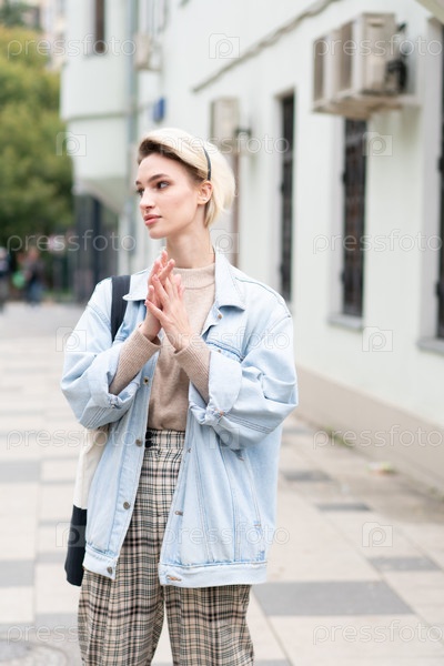 Молодая красивая женщина позирует в синей куртке на улице