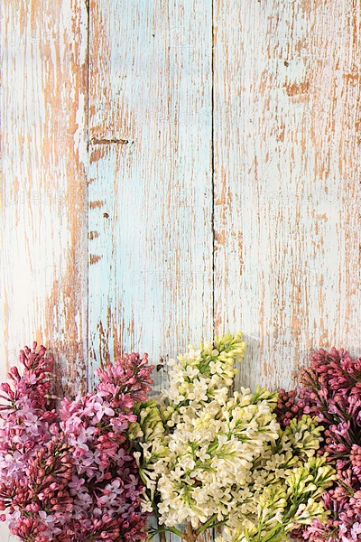 Красивый натюрморт с ветвями белой и фиолетовой сирени на деревянном фоне, шаблон для дизайна и флаер для экрана. Абстрактная цветочная композиция. Весенняя поздравительная открытка, подарок для любимых