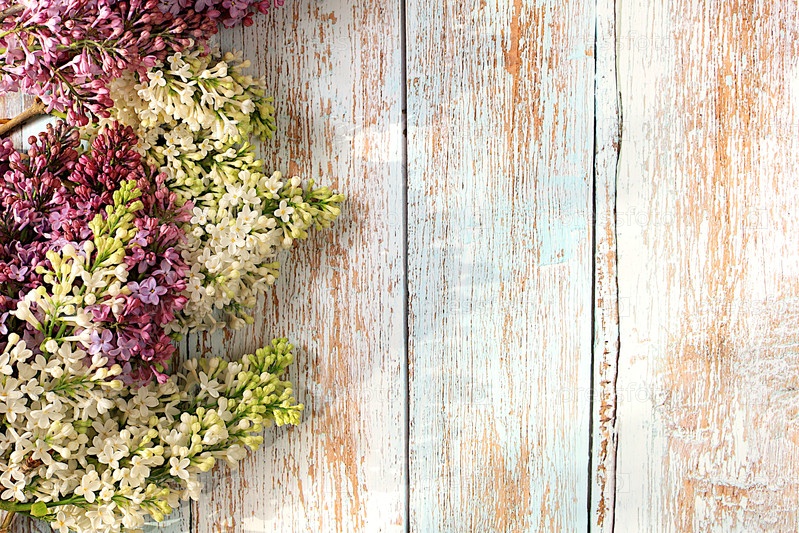 Красивый натюрморт с ветвями белой и фиолетовой сирени на деревянном фоне, шаблон для дизайна и флаер для экрана. Абстрактная цветочная композиция. Весенняя поздравительная открытка, подарок для любимых