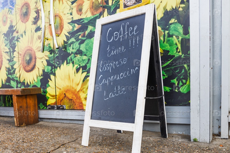 Доска для мела на тротуаре кофейни с рекламой свежего кофе и ежедневных специальных предложений