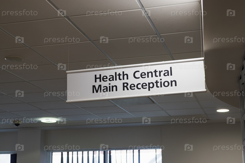 Вывеска главного регистратура Health Central подвешена к потолку в чистом, современном коридоре больницы