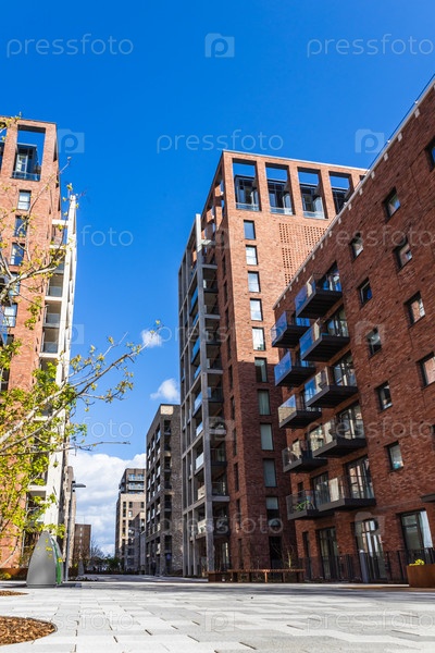 Городской жилой район с высокими зданиями из красного кирпича и ясной солнечной погодой на чистой улице