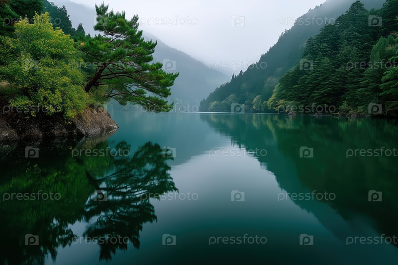 Лесистая горная долина со спокойной рекой или озером