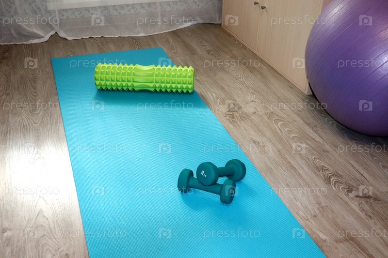 Спортивный инвентарь коврик для йоги, гантели, рол и часть фитбола у шкафа в комнате