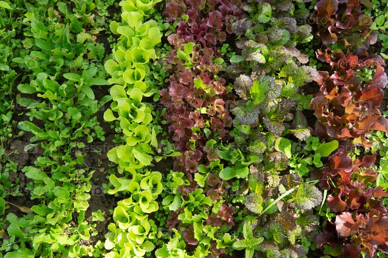 Ряды салата и горчицы разных цветов на грядке