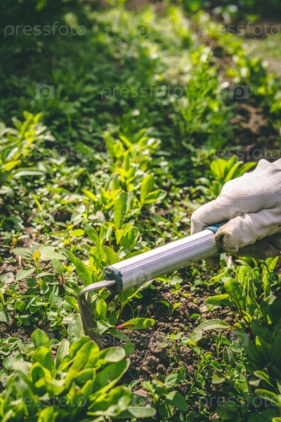 Женщина в перчатках обрабатывает мотыгой растения в саду