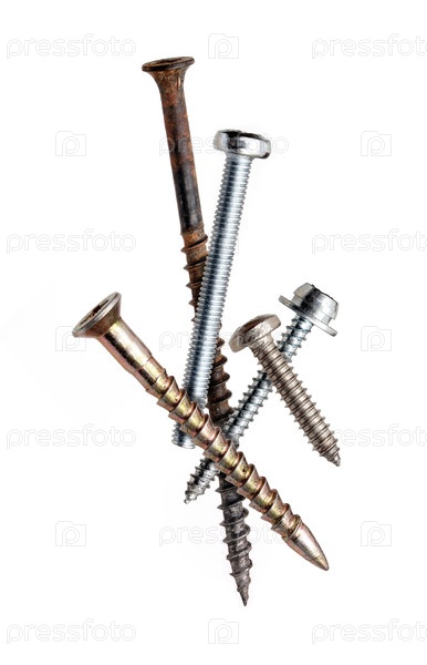 Металлические винты, шурупы и саморезы, изолированные на белом фоне